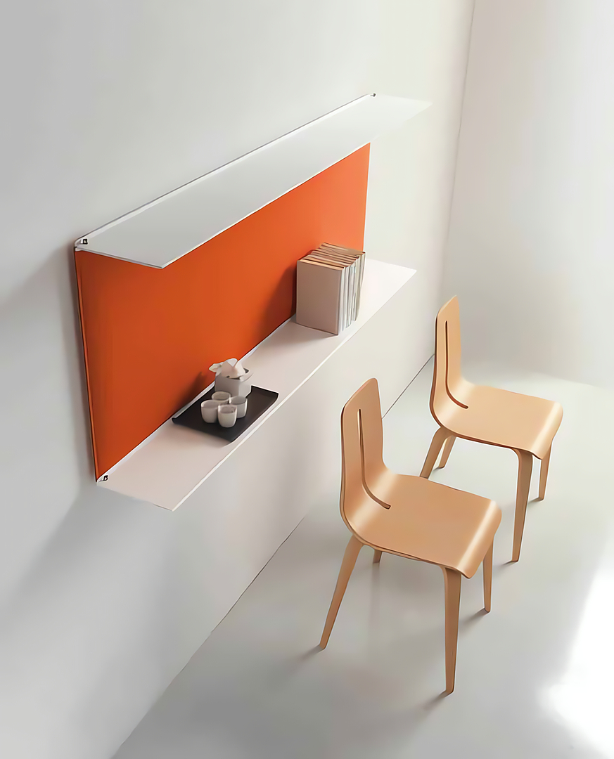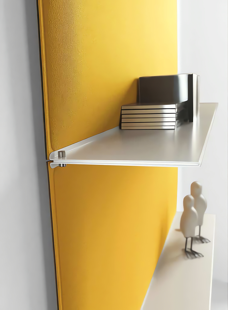 Blade es un sistema de estantes modulares en altura cuyo respaldo está compuesto por paneles fonoabsorbentes realizados con la tecnología Snowsound. Gracias a sus estantes delgados, la imagen del objeto en su conjunto es muy ligera y minimalista. Los estantes, de acero barnizado, constan de un elemento de soporte que se fija a la pared y un revestimiento exterior (superficie de apoyo) muy delgado.