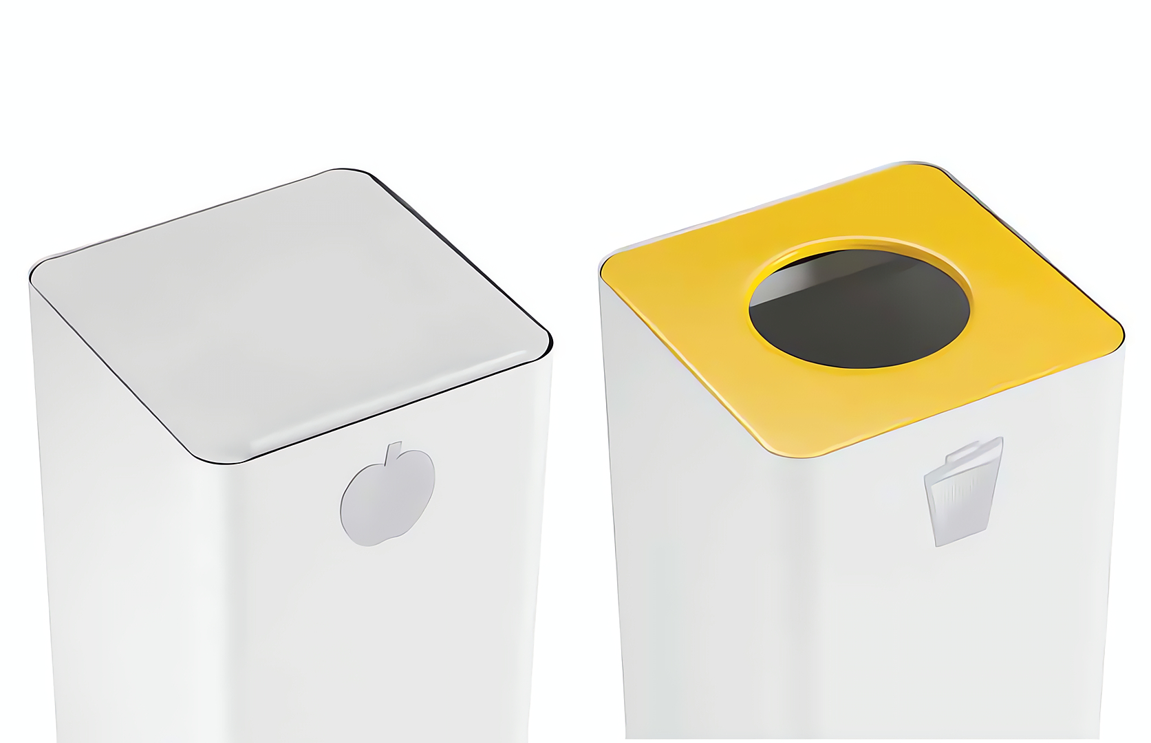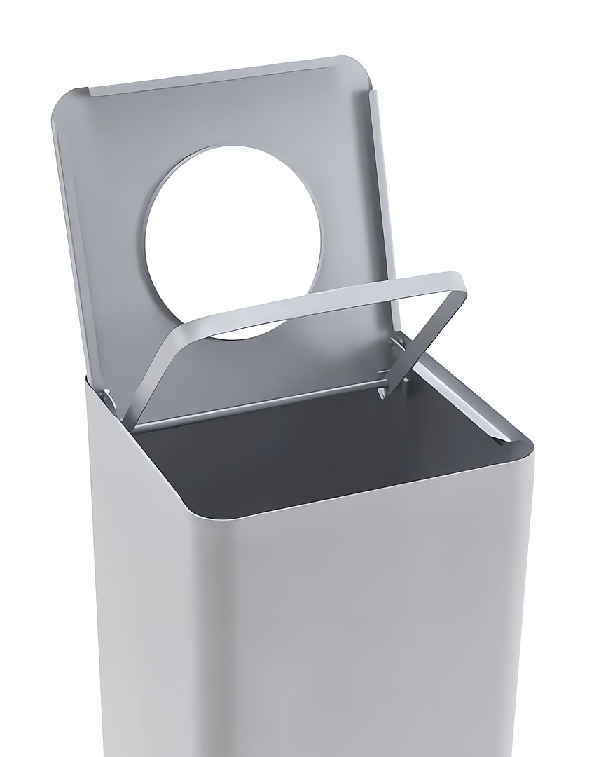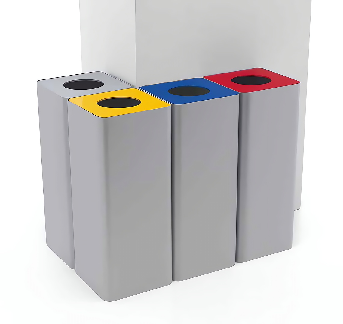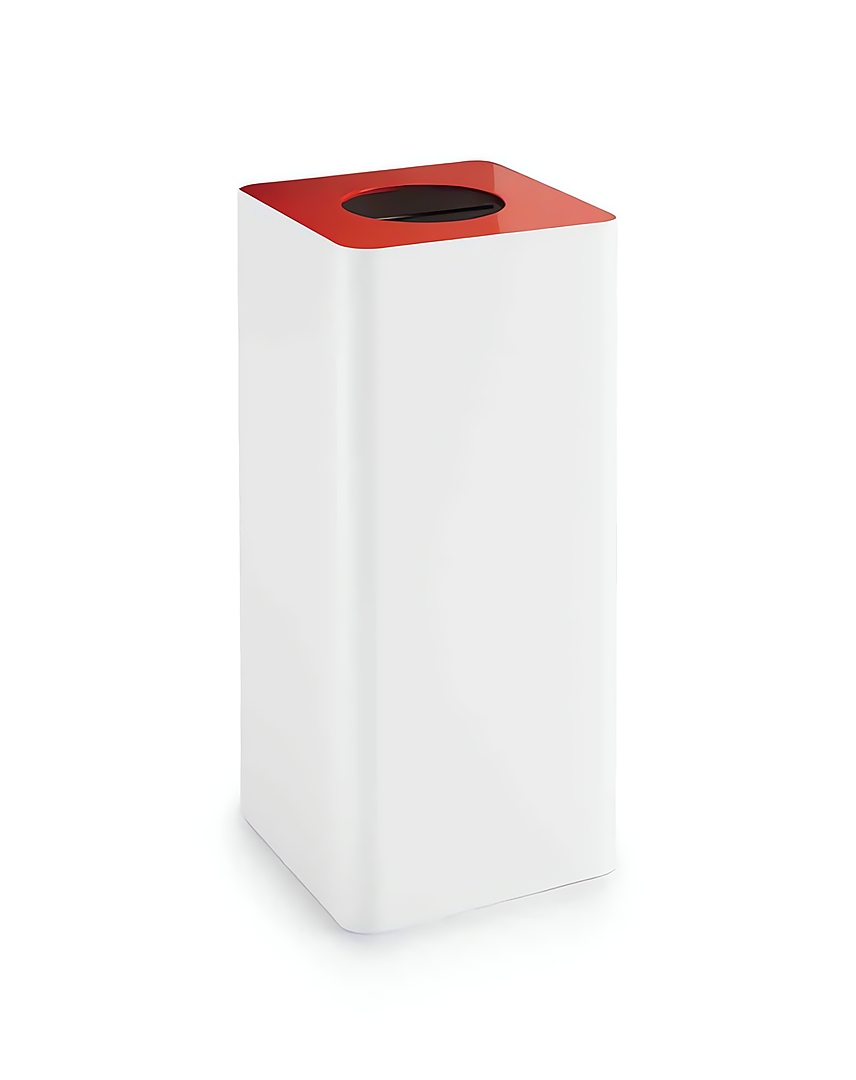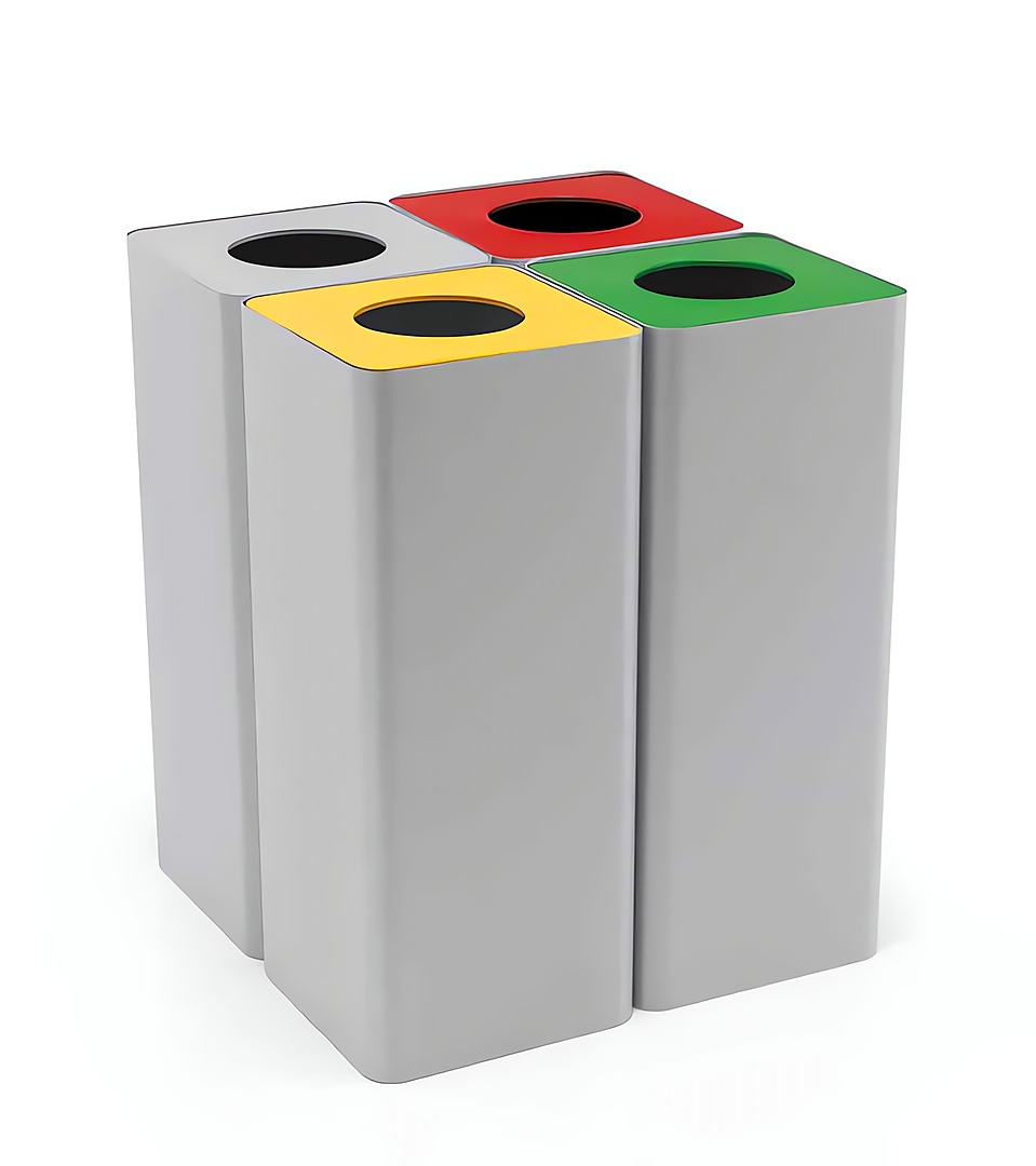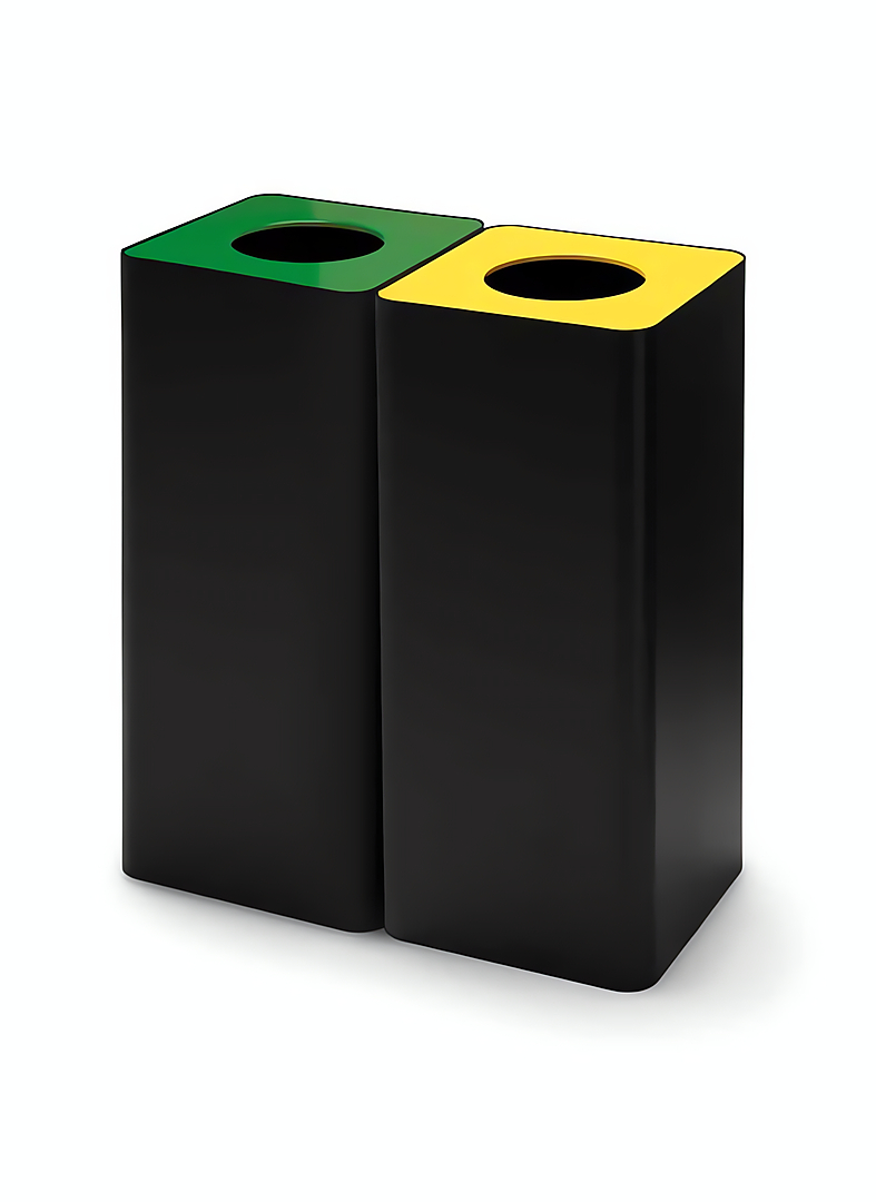 Cestos diseñados para recogida selectiva totalmente realizados en acero recubierto con polvos epoxi, equipados con tapa y sujeta bolsas basculantes.