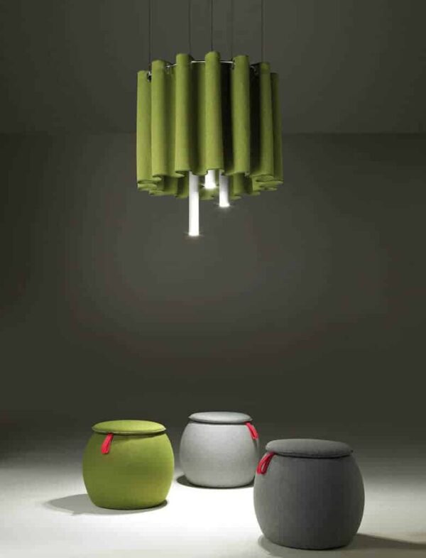 Elementos fonoabsorbentes de forma circular, realizados con los tejidos Snowsound-Fiber 3 Melange. La estructura se construye mediante un elemento tubular de acero cromado y cuelga de unos cables que poseen un sistema de regulación de la altura. Gracias a las distintas medidas de las estructuras, se pueden ubicar tanto en pequeños como grandes espacios, y ofrecen la posibilidad de instalar lámparas en su interior.