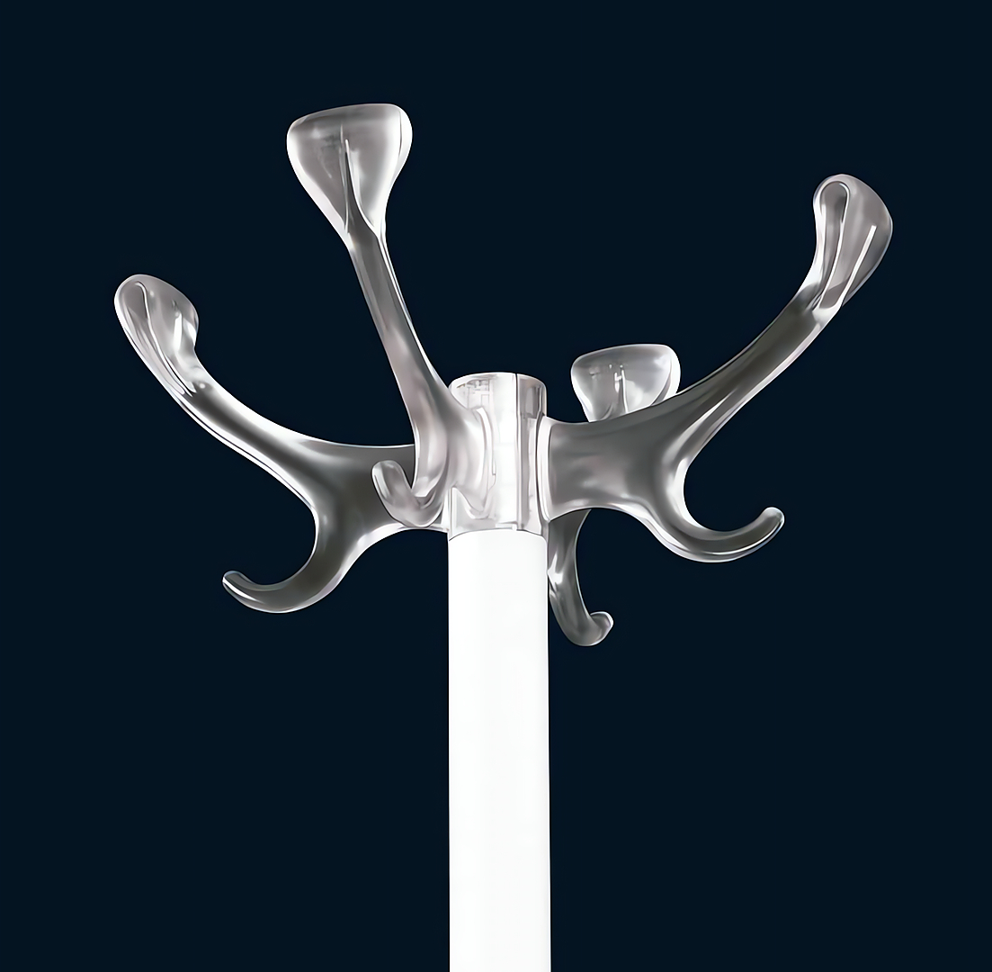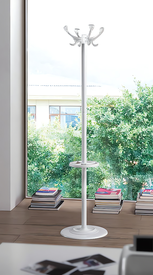 Perchero de pie con estructura en acero recubierto con polvos epoxídicos. Cabezas en tecnopolímero. Aro paragüero exportable en tecnopolímero.