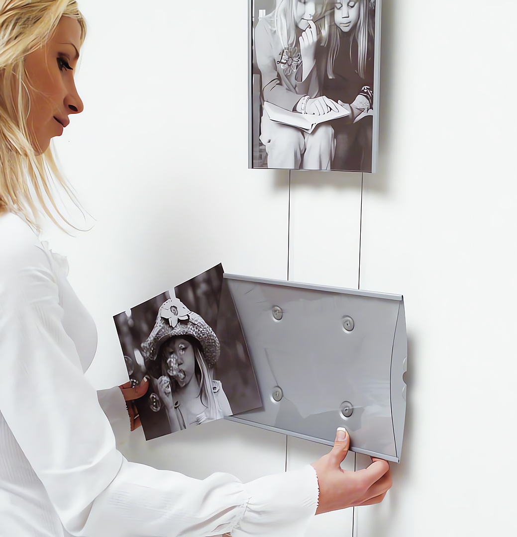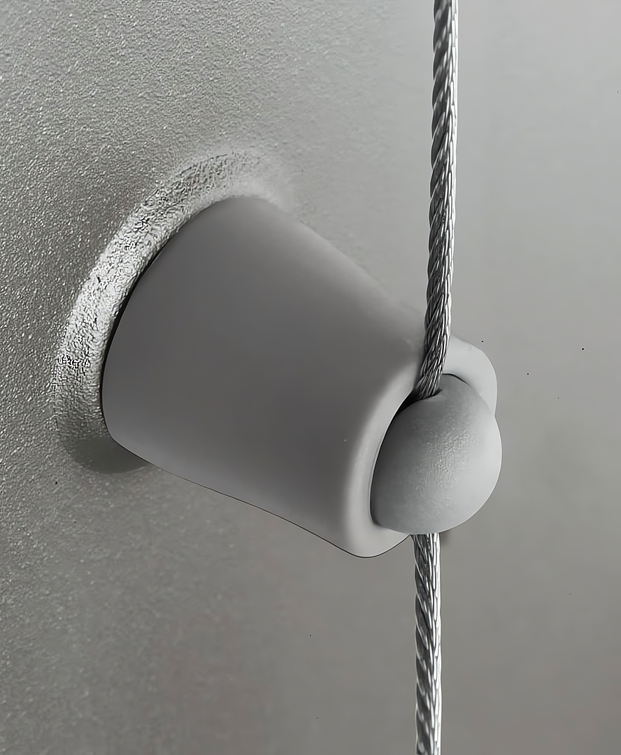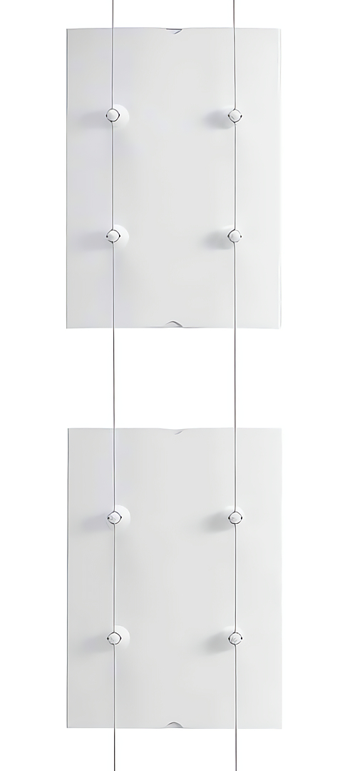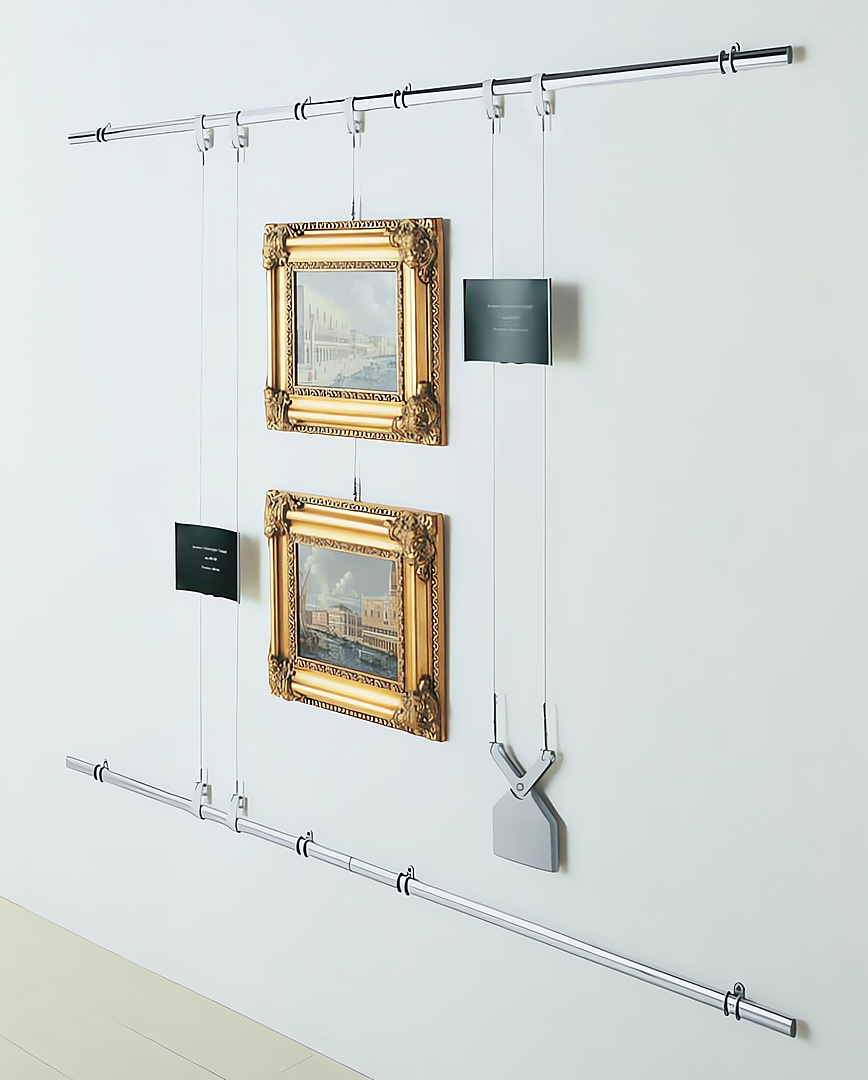 Los expositores se pueden aplicar en dos cables de acero con diferentes soluciones para sujetarlos a la pared o al techo.