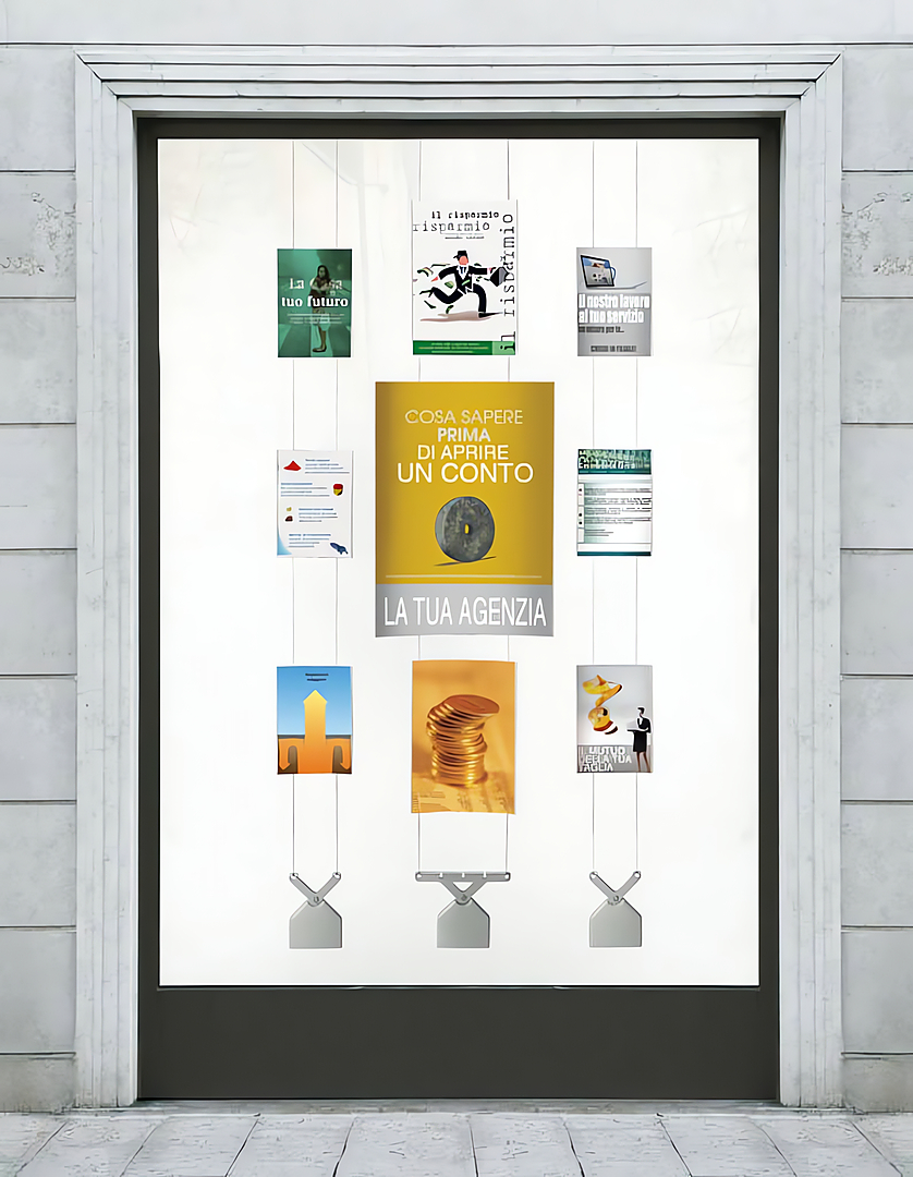 Sistema patentado de señalizacion y comunicacion compuesto por una serie completa de expositores y portafollettos en acero recubieto con polvo epoxi y PET trasparente, disponibles en diversos formatos. Terminales de conexion en tecnopolimero.