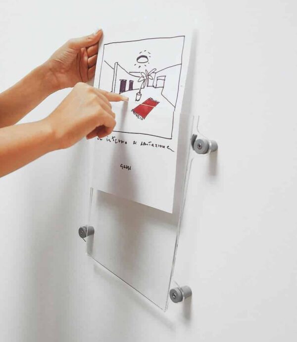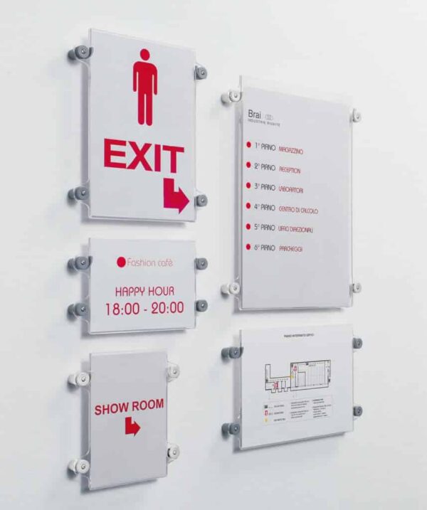 Sistema patentado de señalizacion y comunicacion compuesto por una serie completa de expositores y portafollettos en metacrilato trasparente, disponibles en diversos formatos. Terminales de conexion en tecnopolimero. Los expositores pueden aplicarse a la pared de vidrio mediante biadhesivo, o mediante fijación directa a la pared con tornillos o con soporte de pared de bandera de una o dos caras.