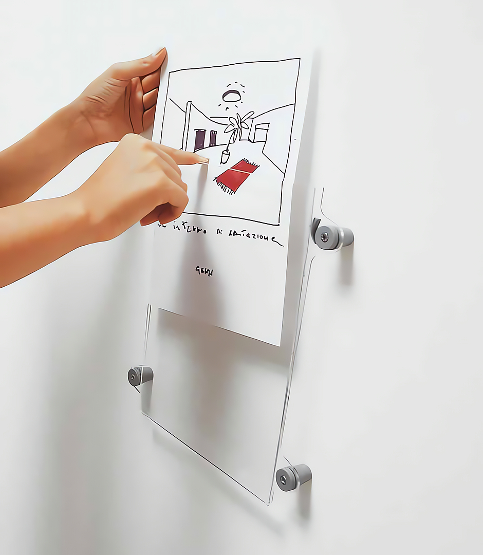Sistema patentado de señalizacion y comunicacion compuesto por una serie completa de expositores y portafollettos en metacrilato trasparente, disponibles en diversos formatos. Terminales de conexion en tecnopolimero. Los expositores pueden aplicarse a la pared de vidrio mediante biadhesivo, o mediante fijación directa a la pared con tornillos o con soporte de pared de bandera de una o dos caras.