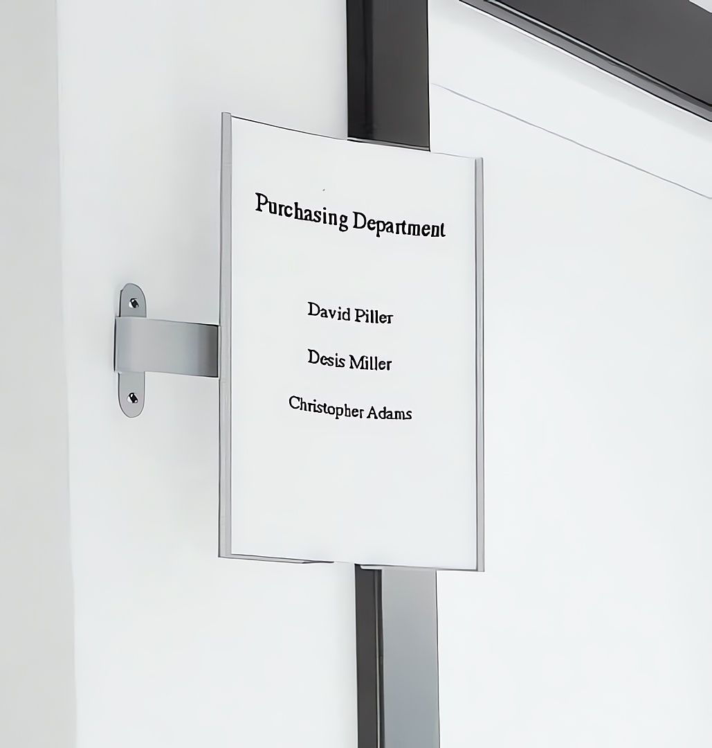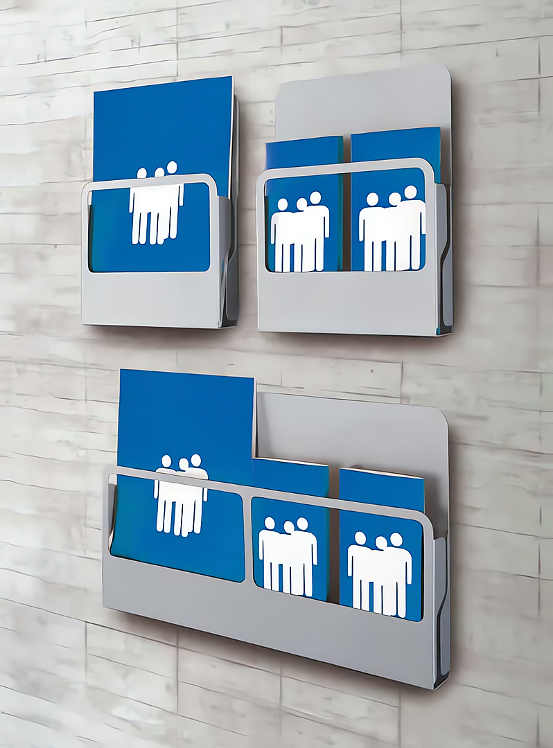Sistema patentado de señalizacion y comunicacion compuesto por una serie completa de expositores y portafollettos en acero recubieto con polvo epoxi y PET trasparente, disponibles en diversos formatos. Terminales de conexion en tecnopolimero. Los expositores pueden aplicarse a la pared de vidrio mediante biadhesivo, o mediante fijación directa a la pared con tornillos o con soporte de pared de bandera de una o dos caras.
