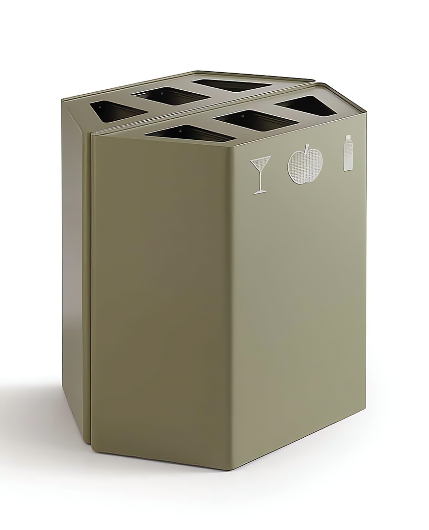 Contenedor de acero barnizado con polvos epoxi. Su peculiar geometría permite situarlo tanto cerca de la pared, de manera que pasa prácticamente desapercibido, como en configuraciones formadas por varios elementos para crear “islas” dedicadas a la recogida selectiva de residuos. Tres tonalidades diferentes enriquecen los matices cromáticos, jugando también con las tapaderas disponibles en colores combinados o en contraste.