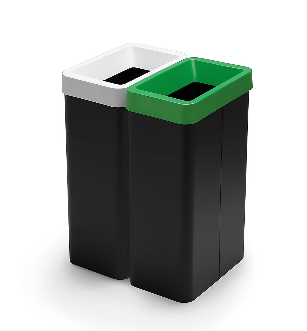 Cestos para la separación de residuos, el bidón y la base son de acero recubierto con polvo epoxi y están dotados de una tapa removible de tecnopolímero, disponible en varios colores.