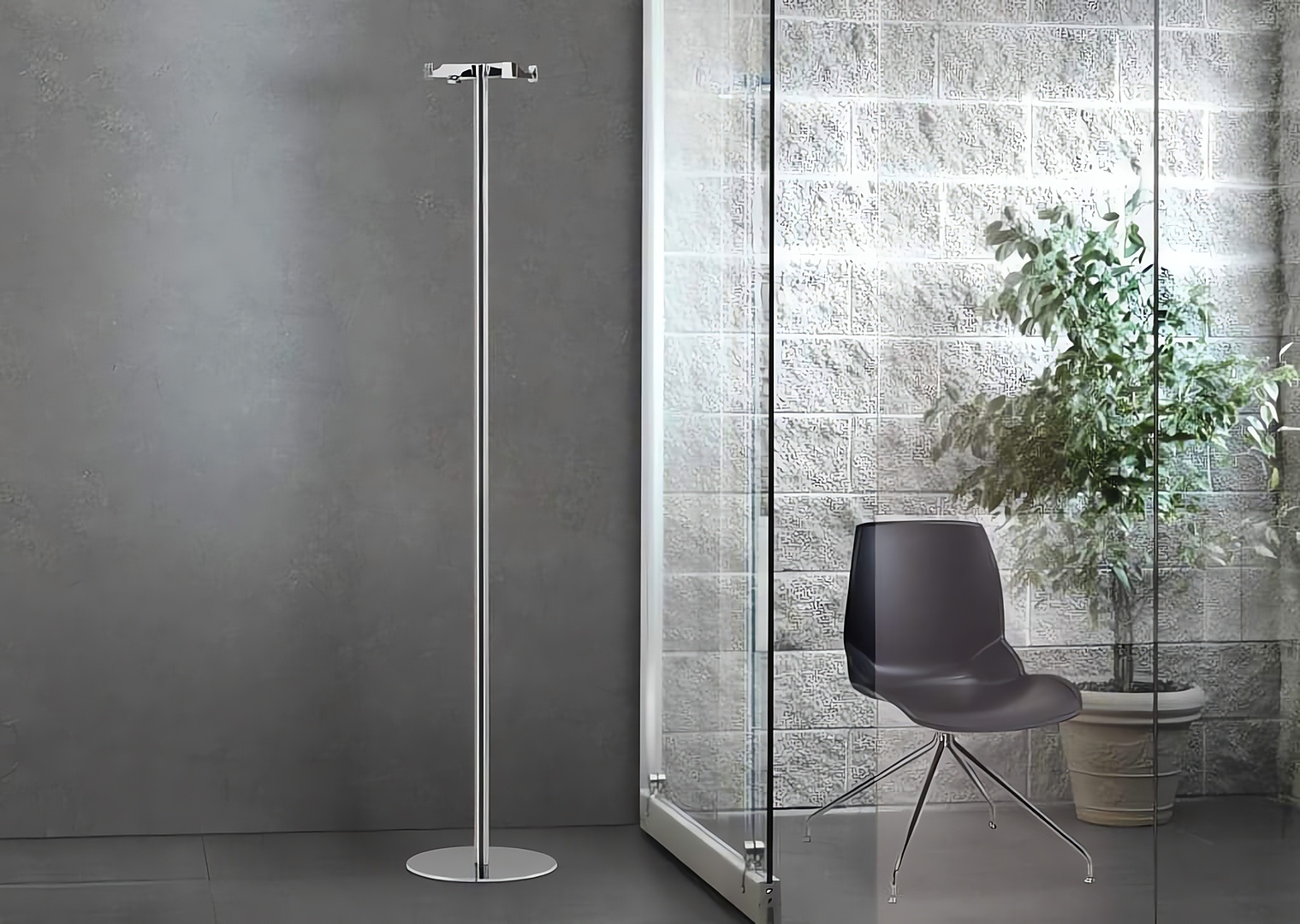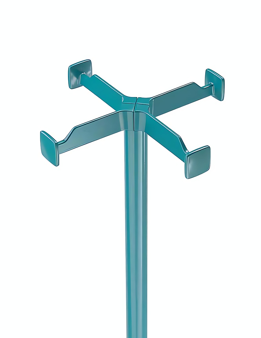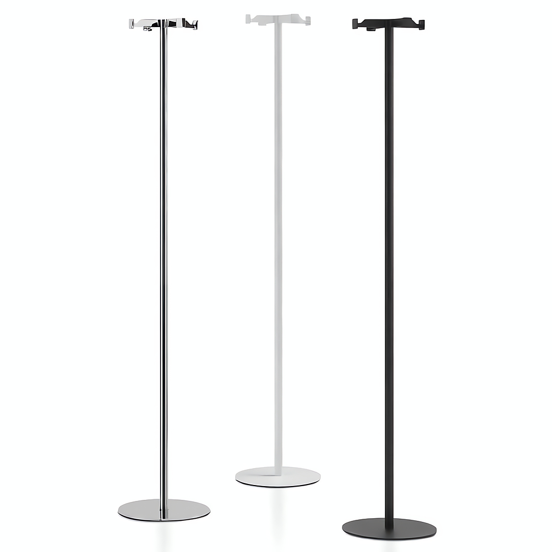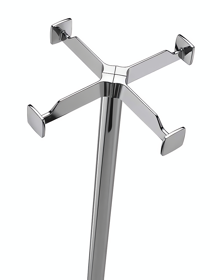 Perchero de pie realizado en metal. Cabezal de zamak y cilindro central de acero cromado o recubierto con polvos epoxi. Base de acero recubierta con polvos epoxi o en acero inox brillante.