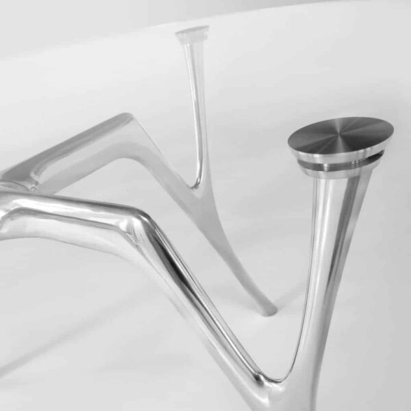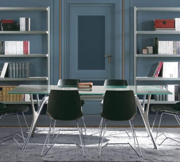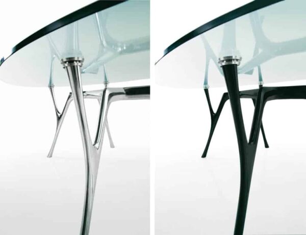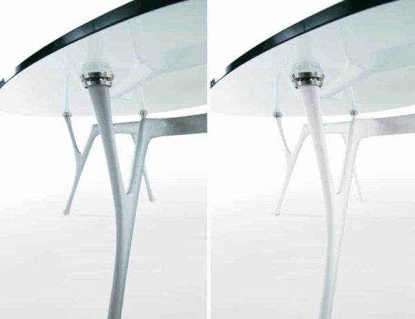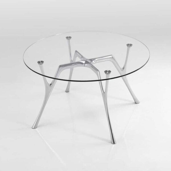 Mesa con estructura de aluminio y superficie de vidrio templado y pulido transparente o satinado. El enganche de las superficies a la estructura se realiza mediante discos especiales de acero inoxidable que están pegados a la superficie.