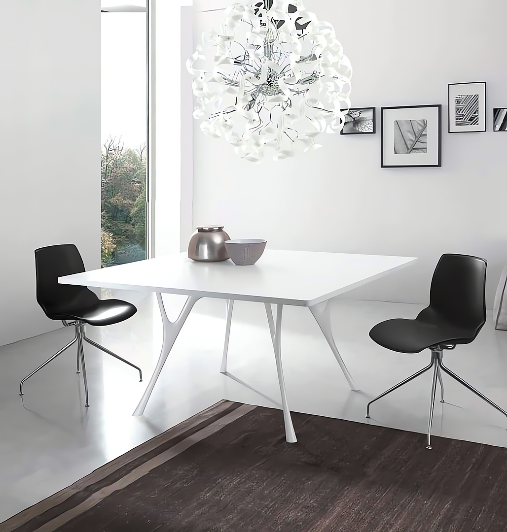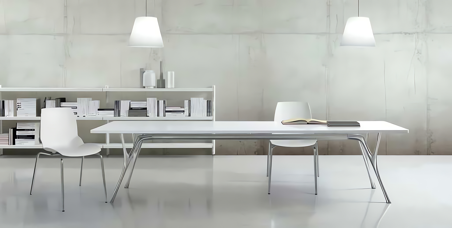 Un diseño riguroso para la mesa Pegaso, estudiado para conseguir grandes dimensiones y propuesto con plano en composito extremadamente ligero, con estructura a “sandwich” que consiste en un núcleo hecho de láminas de madera encerrado entre dos hojas de aluminio recubierto por la parte superior y en los bordes con una lámina de resina acrílica blanca cepillada o recubierto en hormigón donde la artesanía del trabajo hace que cada pieza sea única y exclusiva. La simplicidad y las líneas limpias del plan tanto en la versión de cemento que de resina, contrasta con las formas sinuosas de la estructura, fabricado en aluminio pulido o recubierto.