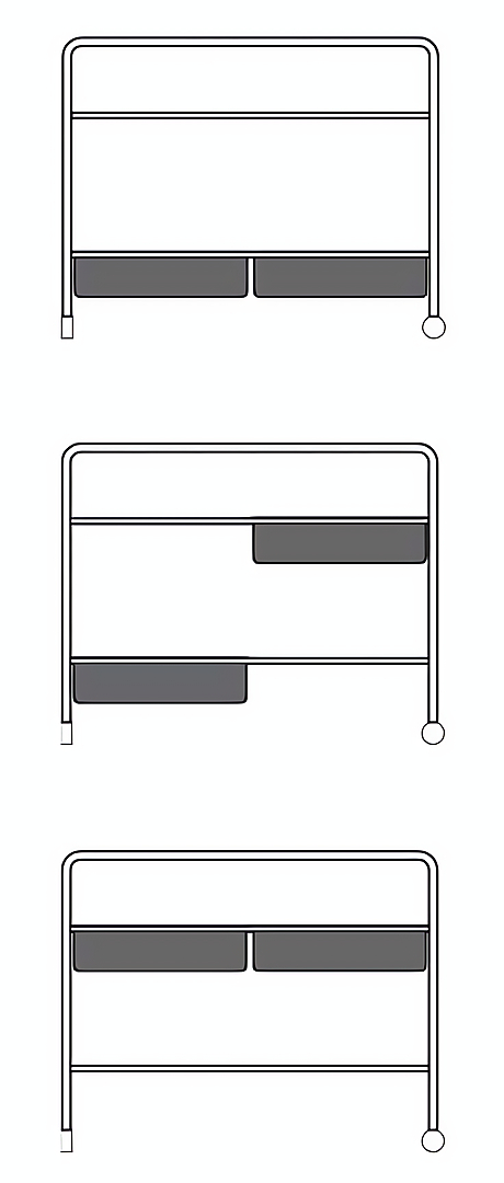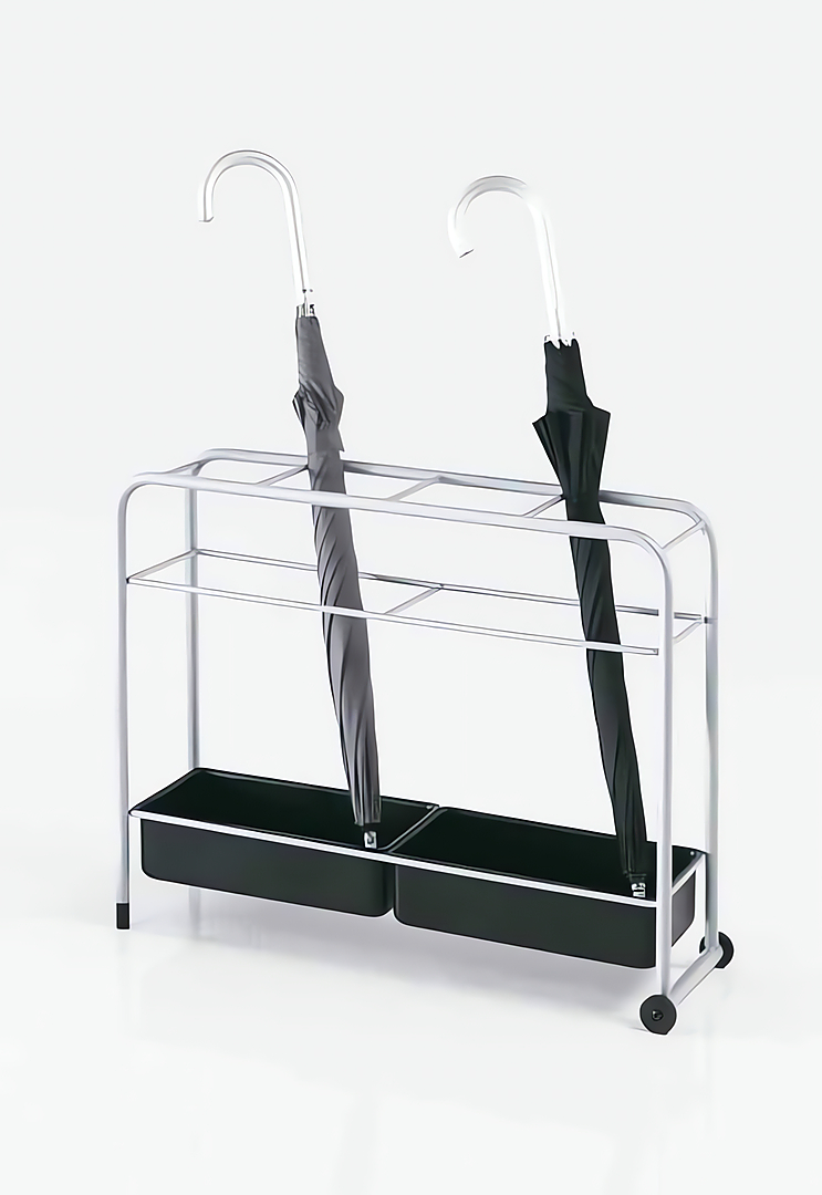 Paragüero con soportes de acero recubierto con polvo epoxi, los recogeaguas pueden colocarse en dos alturas diferentes para contener tanto los paraguas clásicos como los plegables. Las dos ruedas de tecnopolímero facilitan las operaciones de transporte
