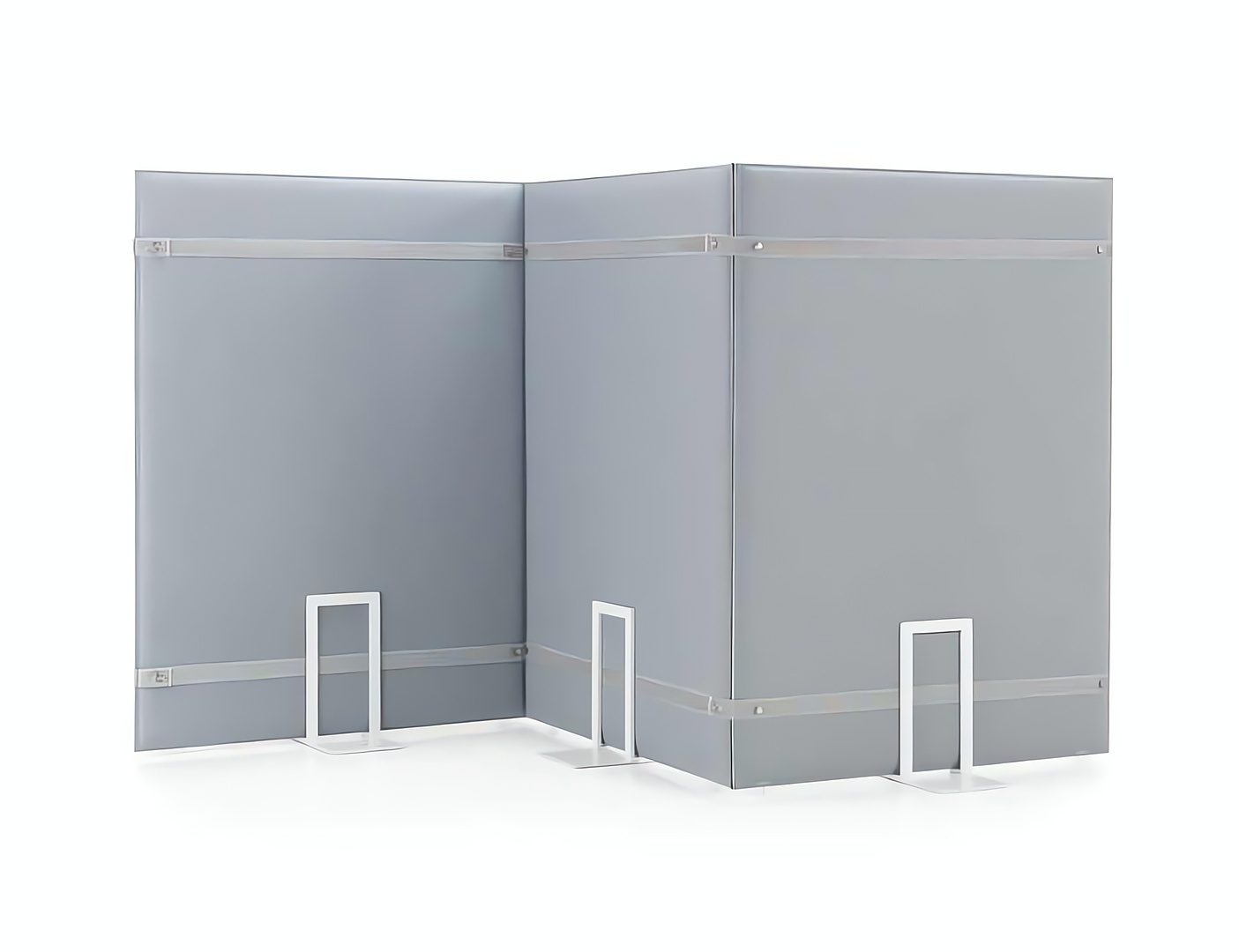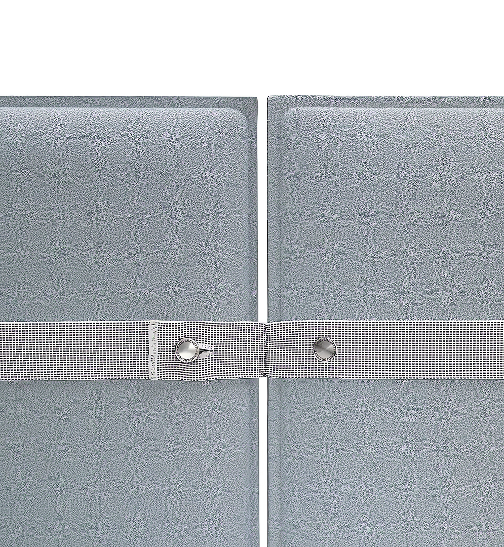 Los paneles se pueden acoplar mediante una correa que los rodea y que lleva botones de acero y ojales para formar soluciones planas, soluciones en “T”, en “L” o en “X”.+