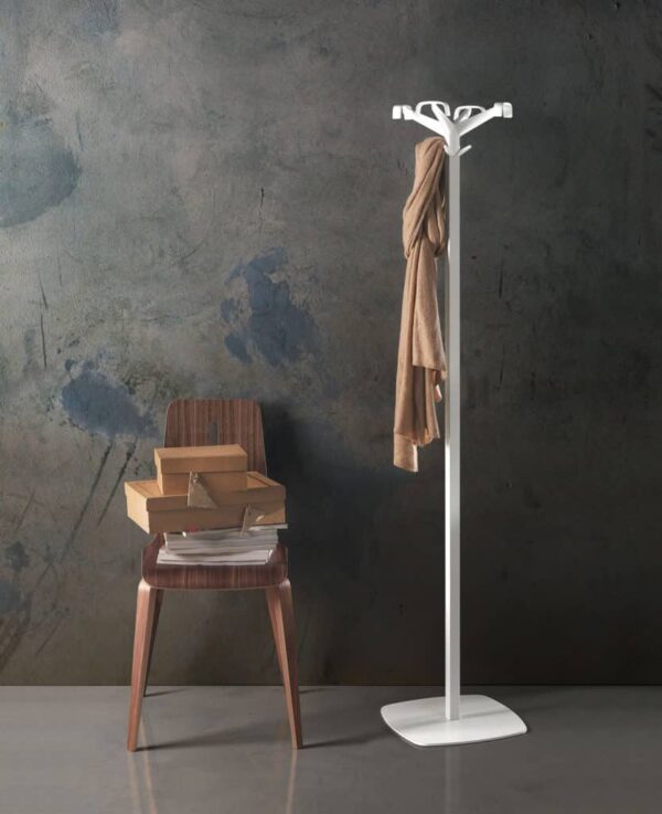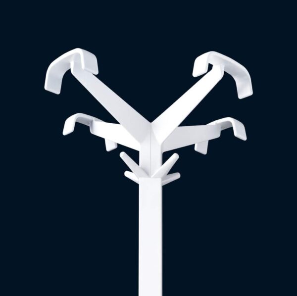 Percheros de pie con tubo central de sección cuadrada y base de acero recubierto con polvo epoxi acabado blanco mate. La cabeza es de policarbonato acabado blanco mate.