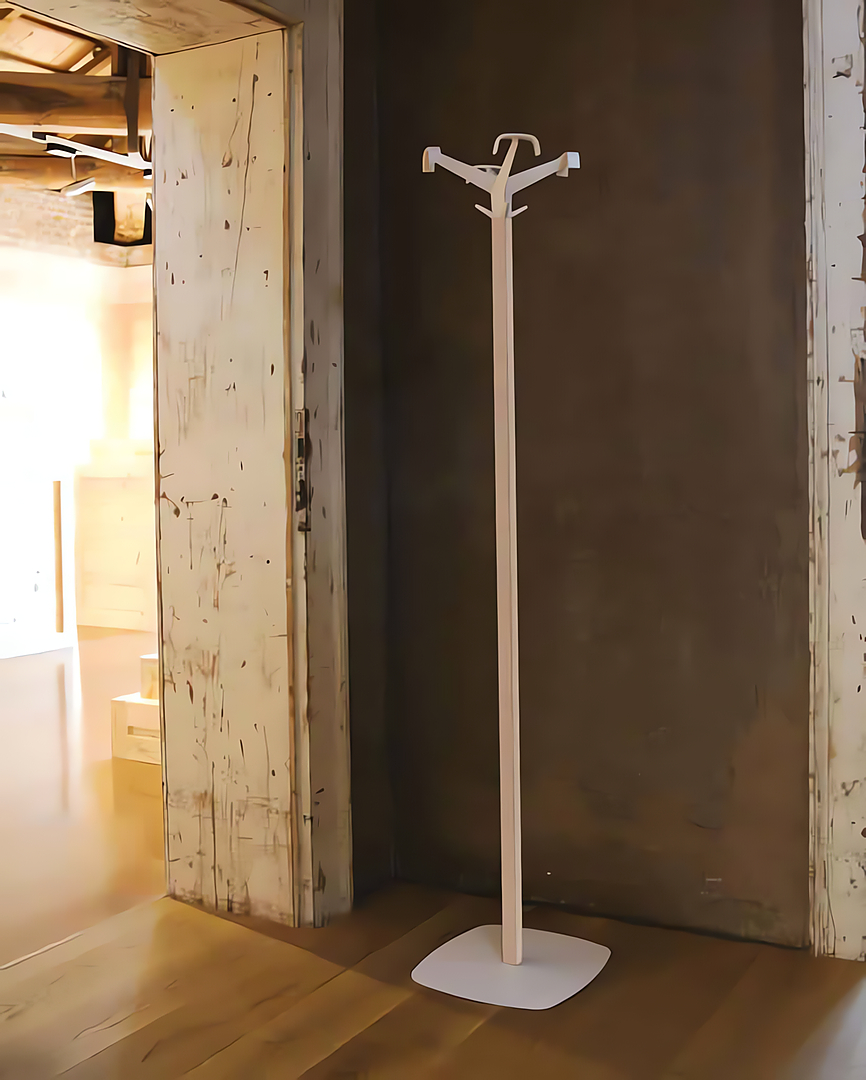 Percheros de pie con tubo central de sección cuadrada y base de acero recubierto acabado madera. La cabeza es de policarbonato acabado blanco mate