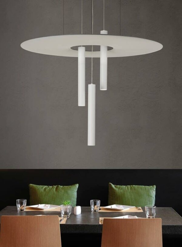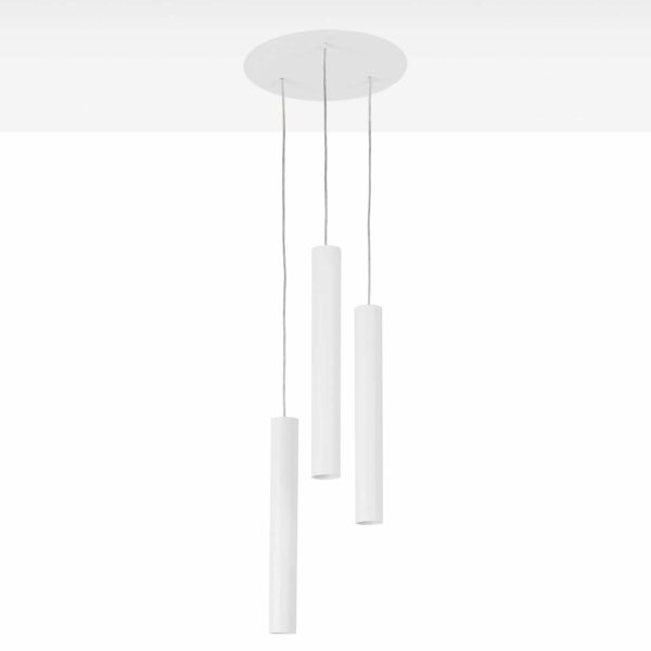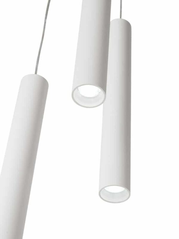 Este elemento de iluminación colgante se puede equipar con 1 o 3 fuentes de luz de LED, de 10W cada una. Los cuerpos de iluminación son de aluminio pintado y poseen un cable de alimentación transparente, cuya longitud se puede modificar para colocar las lámparas a alturas diferentes. Las fuentes de luz desplazadas hacia atrás garantizan un excelente confort visual.