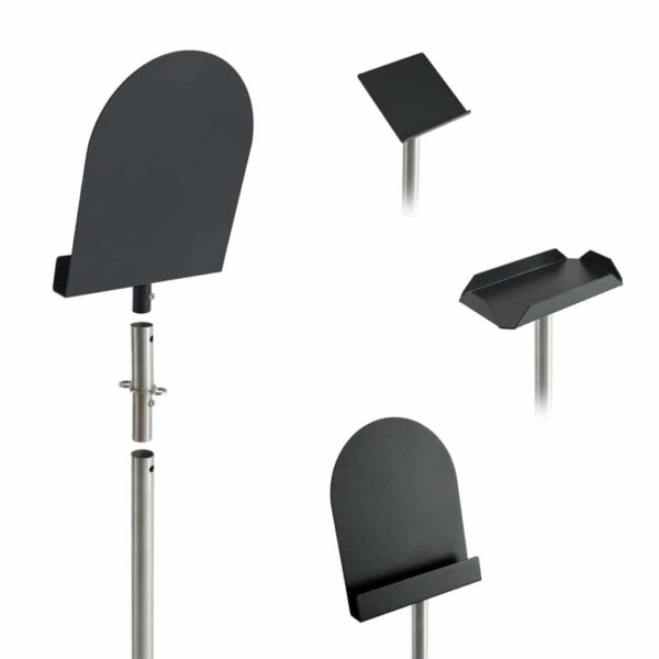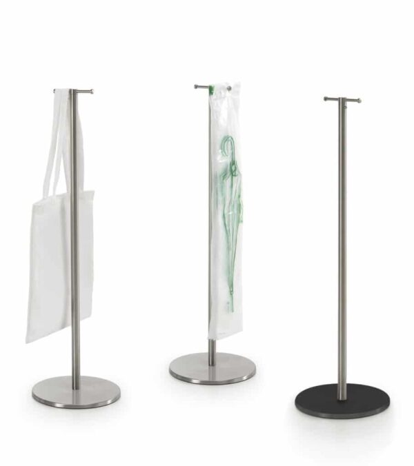 SET está formada por un poste de acero inoxidable satinado con base circular, disponible con acabados en acero inoxidable satinado o recubierta en color negro gofrado. El cabezal del poste está dotado de un innovador sistema de fijación que permite enganchar y desenganchar los accesorios de forma sencilla y rápida. Al enganchar y desenganchar los accesorios,
