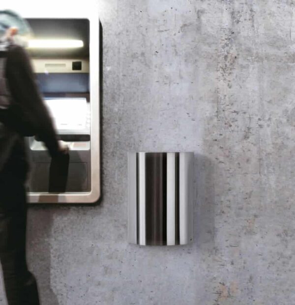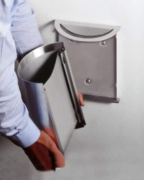 Papelera a pared para exterior, realizada en acero inoxidable AISI 304 con fondo perforado para evacuar el agua de lluvia. Equipado con cerradura de seguridad.