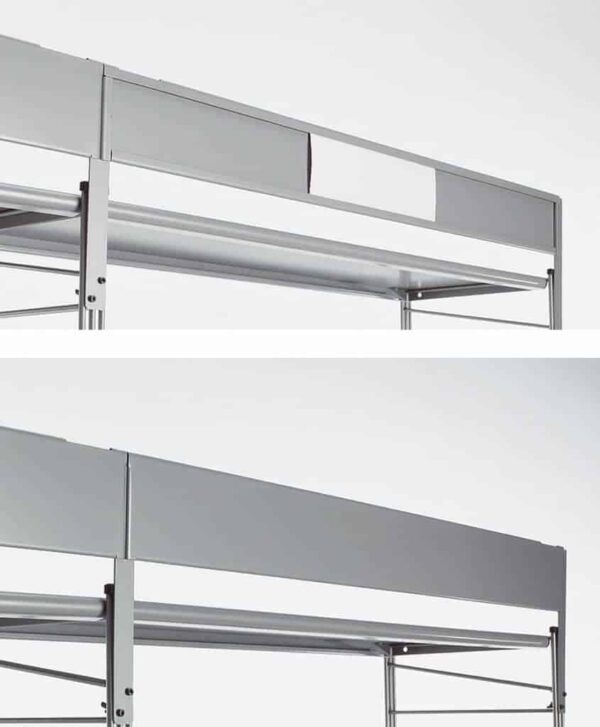 Los estantes de acero tienen un borde en la parte anterior de doble espesor redondeado anti-caida. El doblez lateral permite engancharlos directamente al montante.