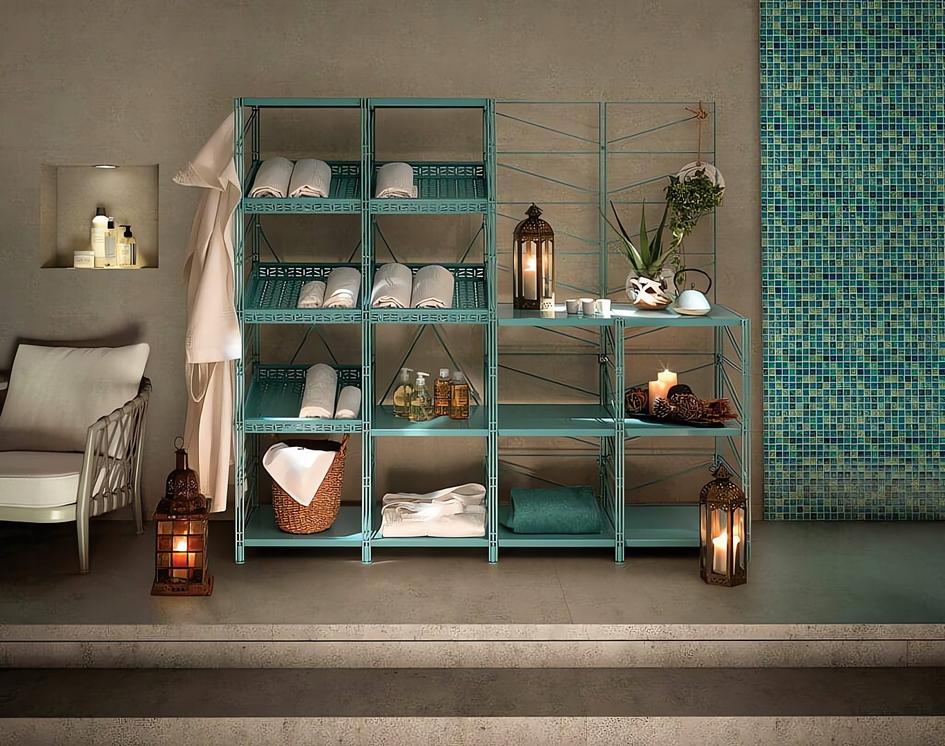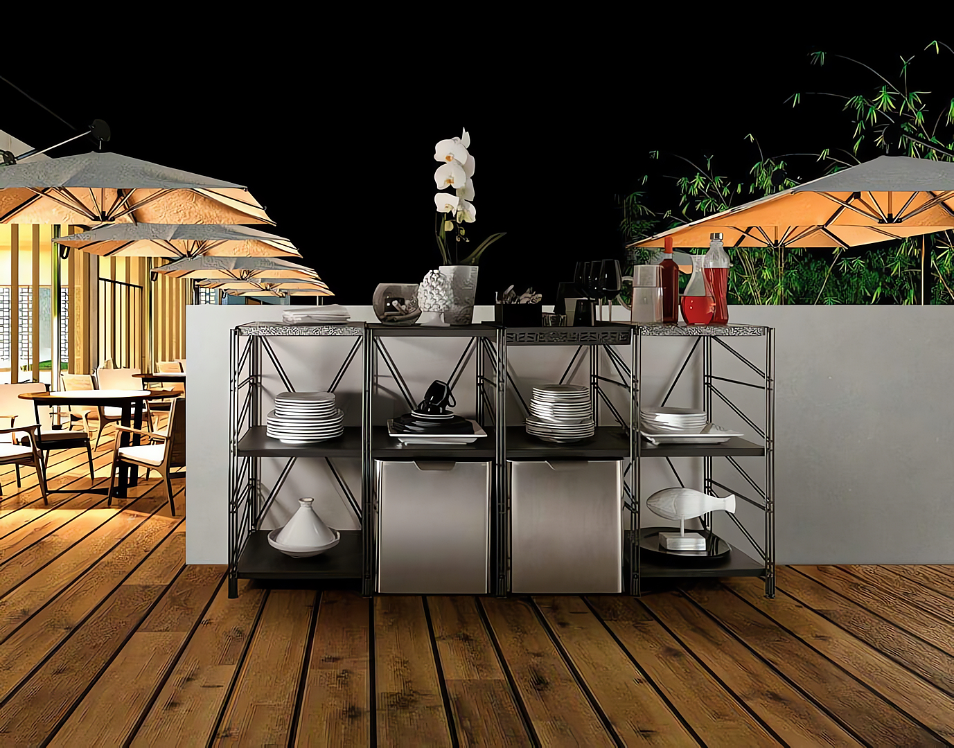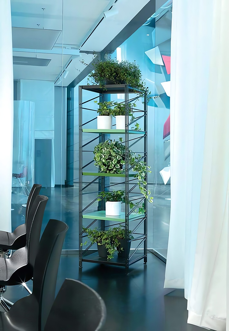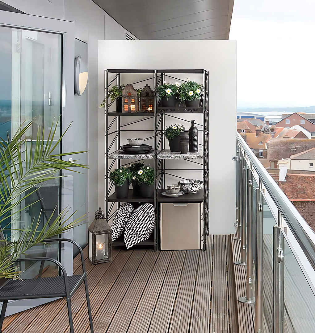 Socrate Outdoor es un sistema modular de decoración para exteriores, concebido como elemento versátil que incorpora diversos accesorios para resultar más funcional a los diferentes espacios, tanto de pequeño como de gran tamaño. Consta de una estructura básica con montantes, crucetas y rejillas de acero galvanizado y pintado y de estantes de metal, mármol, repisas porta macetas, rejillas y contenedores de acero inoxidable o galvanizado y pintado. Se pueden combinar los diferentes colores de las estructuras, estantes y accesorios para conseguir un efecto cromático original.