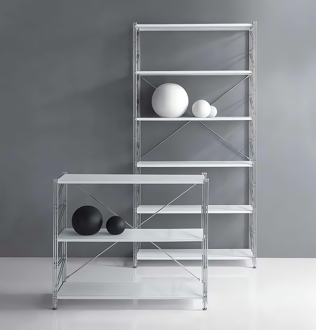 Los estantes de acero tienen un borde en la parte anterior de doble espesor redondeado anti-caida. El doblez lateral permite engancharlos directamente al montante.
