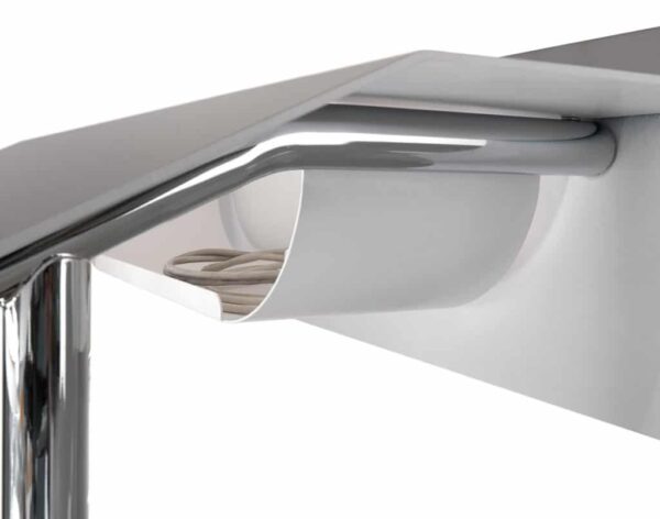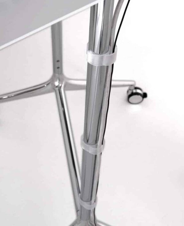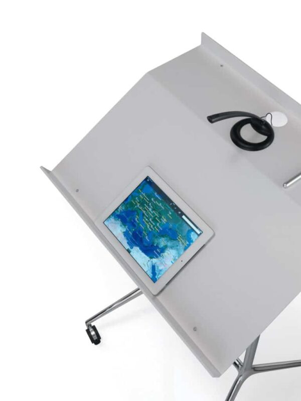 El atril se caracteriza por tener una misma base de aluminio brillante montada sobre ruedas con freno y estructura portante de acero cromado. El atril se puede complementar con una bandeja para el alojamiento de cables con anillos pasacables de tecnopolimero aplicables a la estructura.