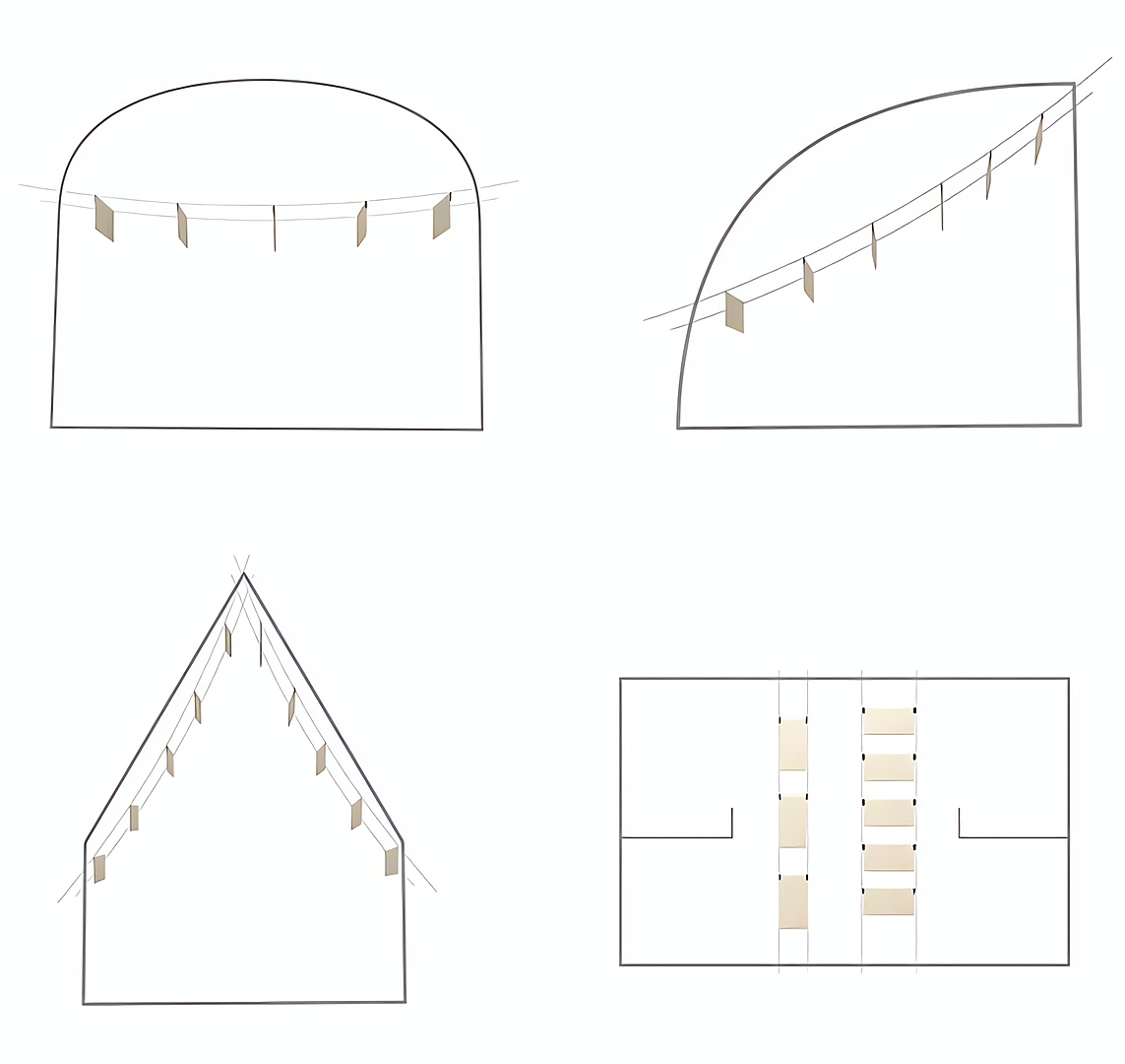 “Dos cables paralelos son el carril estructural de la configuración de paneles para una instalación eficaz fonoabsorbente, básica para mejorar la calidad del sonido en el local. La posibilidad de fijar libremente los paneles a lo largo de los cables ofrece la posibilidad de concebir coreografías muy escenográficas.” (Marc Sadler)